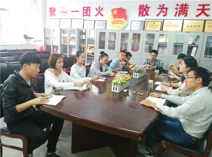9月28日中午,学院团委在学院三楼会议室召开学生社团新学期思想调研暨社团负责人座谈会。本次会议由学院院团委副书记马星宇和学生社团指导老师、2015级辅导员张珺琢共同主持。参加会议的有普通话协会负责人徐淼、爱心中转站负责人周美霞、摄影爱好者协部门负责人夏治林、马克思主义新闻观学习社负责人江志航、动漫爱好者协会李猛和街舞社负责人陶韵、陈展等。