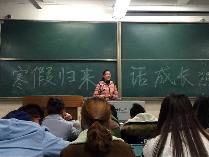 播音及动画中韩班则创新了“话成长”的形式,活动采用比赛制,由各班级抽选代表作为评委为各选手打分,班级也为优秀选手准备了奖品。首先上场的是徐嘉翌,她向大家介绍了自己参加的培养自身气质的辅导机构,并介绍了辅导机构的方方面面。在她的叙述中,我们也能够真切的感受到学习每一项东西的重要性和趣味性,大家也感受到在她介绍在辅导机构认识的朋友时,更是让我们的内心也激起了对远方朋友的思念。第二个上场与我们分享故事的是薛明柯,她告诉我们她每天都会抽出时间练习舞蹈,她提到她因为练习舞蹈而磨破脚尖和摔伤胳膊的时,我们才真正明白,每个人精彩的背后都付出了辛勤的努力。随后,同学们的回忆或轻松随性,或忙碌充实,都证明了这个寒假带来的不仅是欢乐,更是成长。
