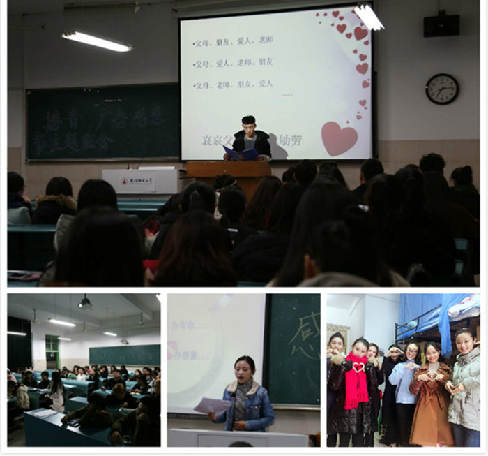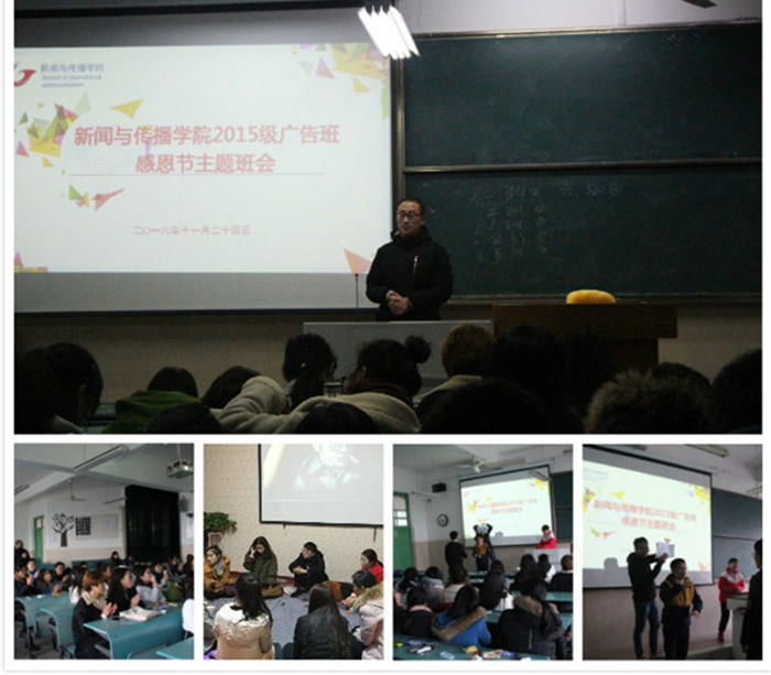 学院其他班级的感恩节主题班会活动也以不同的方式得以展开。15级动画班通过朗读有关父母的感人故事,向同学们传递了“哀哀父母,生我劬劳”的思想,让大家对父母辛苦的付出有了更深的体悟,并在班级同学中引发了广泛热议,产生了较为强烈的效果。16广告班更是以精美的PPT给大家展示了精彩的感恩节大游行、大餐等等。心理健康委员通过提问的方式让大家给父母、朋友、爱人在自己心目中排序,得出统一的结论:感恩始终把父母放在第一位。