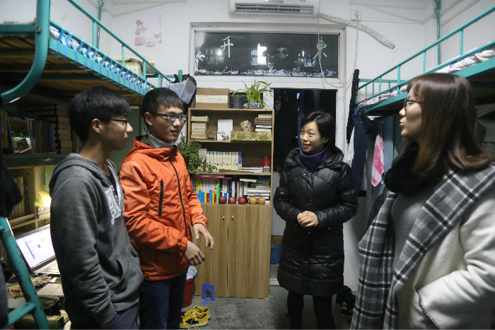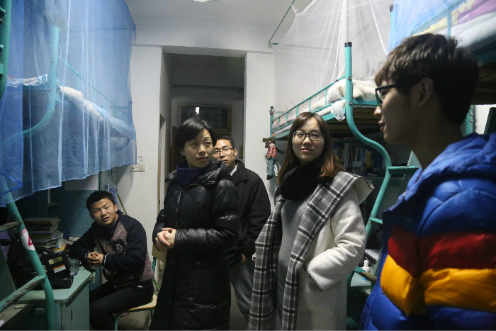 在检查的过程中,学生们主动与领导老师交流自己最近的学习和生活状况。宋静对现在正在创业的学生表示支持和鼓励,她认为在“大众创业,万众创新”的时代,学生们应当主动适应社会新潮流,同时要兼顾学业,合理分配创业和学业的时间;对于一些同学考研的选择,她给予了充分肯定,勉励同学们一定要提前做好规划,耐得住寂寞,静得下心。此外,宋书记还重点询问了同学们生活中遇到的困难,关切叮嘱一位韧带拉伤的同学要注意休息,如果有需要帮助可及时向学院反映,学院会尽可能地给予支持与帮助。每到一处,领导老师除了了解学生的生活、学习情况,还重点排查了宿舍的安全隐患,排查有无晚归不归,有无使用违规电器,有无私拉电线,接线板使用是否规范等。