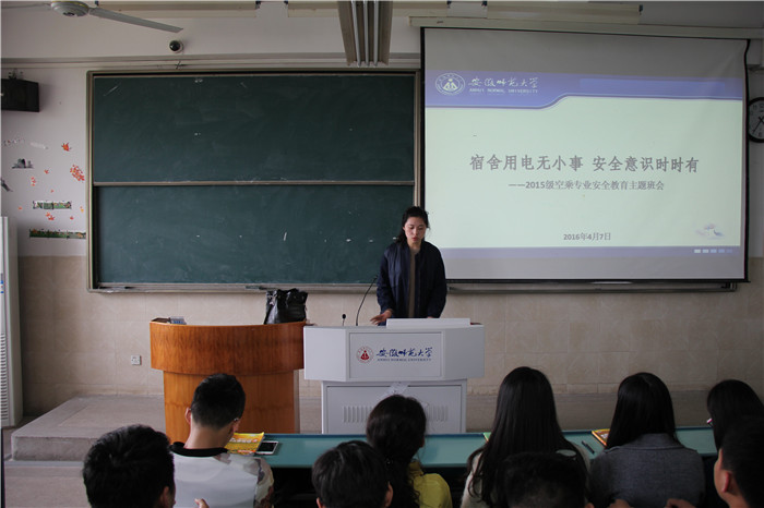 为了增强同学们的安全意识,提高自身的安全防范能力。2016年4月7日下午,15级全体空乘专业学生在教学楼2010402教室召开主题为“宿舍用电无小事,安全意识时时有”的安全教育主题班会,本次班会由辅导员张珺琢主持。