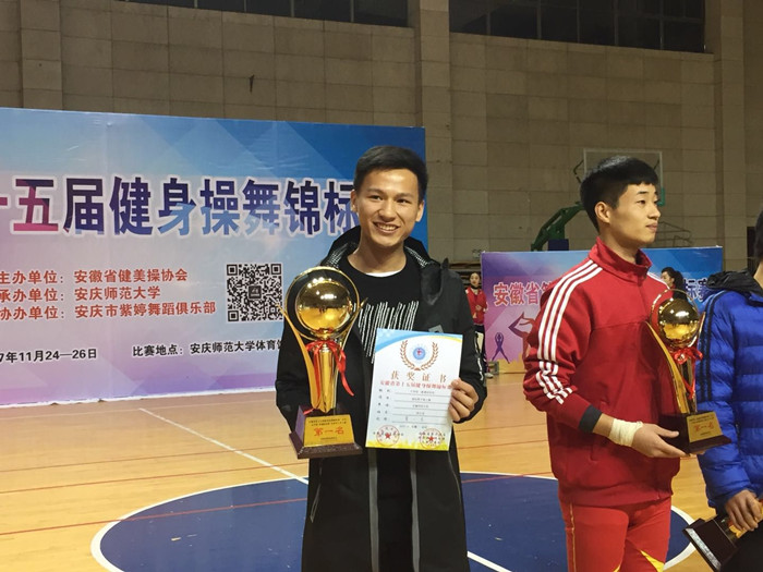 11月25日至26日,由安徽省健美操协会主办,安庆师范大学承办的安徽省第十五届健身操舞锦标赛在安庆师范大学体育馆举行,我院2015级空乘专业陈文龙同学以17.65分的好成绩获得大学组(普通院校组)竞技男子单人操项目比赛第一名。