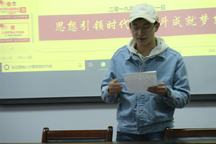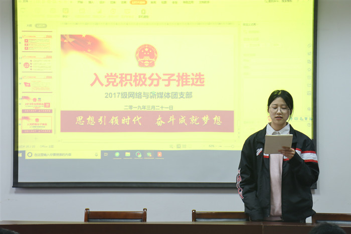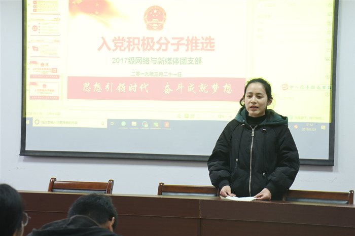 思想引领时代,奋斗成就梦想。3月20日下午4点半,2017级网络与新媒体专业在学院楼四楼会议室开展“奋进新时代,筑梦新征程”主题团课学习暨入党积极分子推优。团支书宋诗雨主持会议,辅导员张雁及全体学生参会。