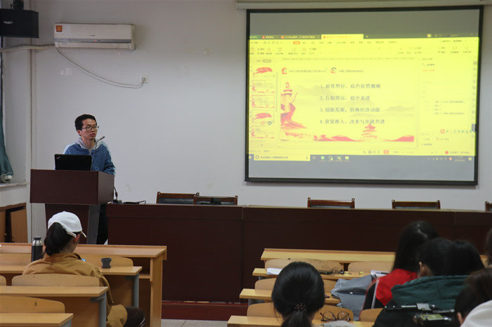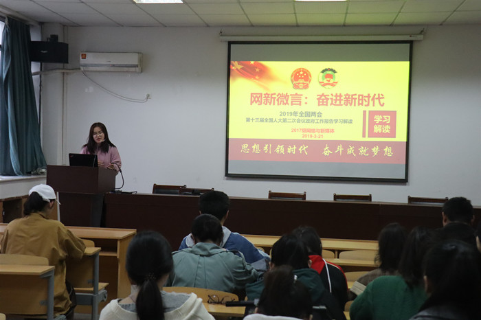 会上,聚焦十三届全国人大二次会议和全国政协十三届二次会议,从两会的政府工作报告出发,回顾2018年政府工作内容,分析2019年经济社会发展总体要求和政策取向,展望2019年政府工作,得出“奋斗创造历史,实干成就未来“的结论。为提高同学们对两会学习的热情,宋诗雨结合多媒体,以鲜活的视频和生动的民间故事展现两会工作报告,深刻贯彻了习近平提出的“全媒体时代媒体融合发展”的重要论断。