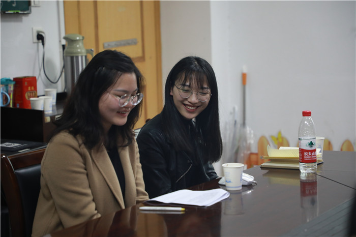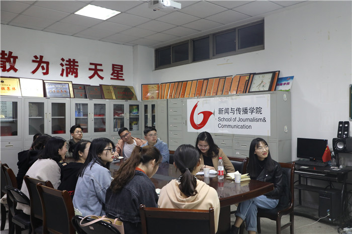 2019年3月26日晚,在德赢AC米兰合作伙伴院楼三楼会议室,2015级新闻学专业的王豪、胡银银同学,正在和2017级新闻学专业的同学们,分享着自己在大学四年中的实习经历,以及在其中获得的经验。