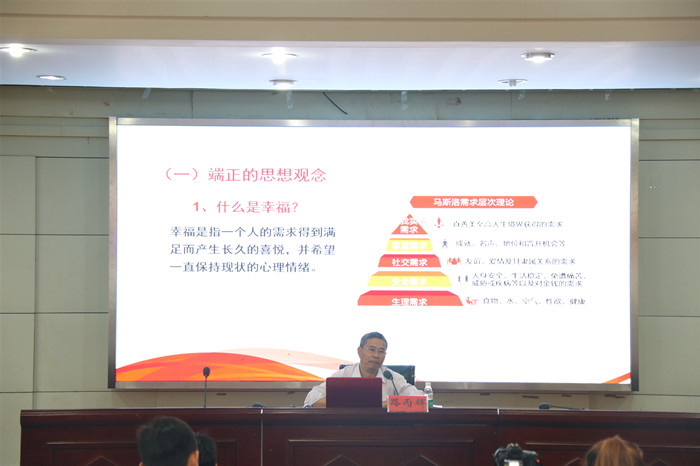 路丙辉向学员们解读了人生幸福的基本内涵,讲述了什么是幸福,强调了想要幸福需要使命感、责任感、荣誉感与成就感,表示学校可以等你长大,社会不会等你长大。他认为,想要幸福需要端正的思想观点,应有客观的现实认知,积极的人生态度,增强人生智慧涵养,实事求是的看待社会现实,客观公正的看待社会事件,客观理性的看待个人得失,还应有正确的价值判断,不攀比,不强求,不求全,拥有基本的生活能力,培养良好的德行修养。路丙辉用健康、家庭、朋友、职业四个关键词总结人生幸福。