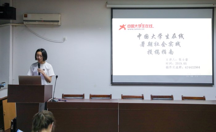张士睿就中国大学生在线校园通讯站为例进行投稿培训。她从平台简介、投稿细则、撰稿培训三大部分展开介绍。投稿细则部分,张士睿详细说明了投稿途径、主题内容以及图文、组图、视频投稿的要求和操作步骤。投稿培训方面,她先依次讲解了通讯的五大类型,继而结合历年稿件深入解说图片拍摄的要领,通过定题、立意、拍摄要点等为各团队提供了学习借鉴的经验。