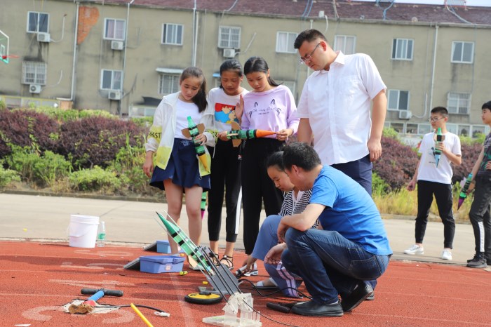 花桥镇团结小学坐落在九三公路旁,即使现在已经是暑假时间,但依然可以看到还是有部分学生在学校的少年宫进行着课外实践活动,实践队员到达现场时,相关的老师正在教学生们如何更高更快更准的发射“水”火箭。学生们练习的“水”火箭的材料,大部分来自于日常生活中可再利用的材料,“水”火箭的机身便是由塑料瓶子构成,两头配有活塞,可以重复使用,使用时将瓶子装上水,再通过加大瓶子内压力的方法使“水”火箭“发射”出去,“水”火箭可以重复使用,相对而言“神箭”的发射成本就高的多了。“神箭”只能是一次性发射,所以每次的发射都得经过精细的计算。学校周围的文化场所并不多,有的只有这个占地不多的少年宫,暑假已到,依旧有不少学生出入少年宫,参与着各种各样的课外活动,少年宫为学生提供的活动也在不断的丰富。教育是乡村振兴的一个重要方面,实现乡村振兴,首先要让人民安心留在乡村,让孩子享受到优质的教育,才能减少农民为了孩子的教育离开乡村的情况。后期实践队员将会对团结小学进行更深一步的采访。