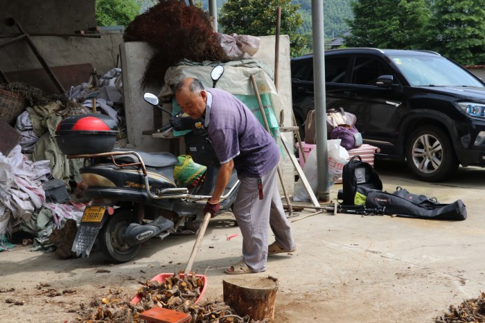 从劈开分拣、到陈晒烘干,一车的药材就要花上大半天的时间。如同炒菜的关键是火候,成就美味的前提是要让食材均匀受热,辅以适当翻炒。虎杖的陈晒也值得考究,太阳就是柴火,祝光荣就是掌勺。恰到好处的阳光将药性封藏,同时防止虎杖变质。