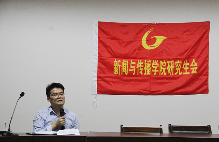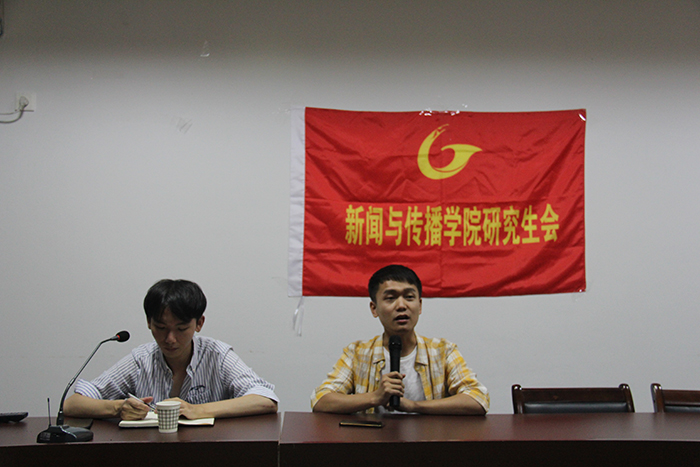 第十届研究生会主席刘杰向大家简单介绍了研会招新、研会各部门具体分工及研会即将要举办的活动,他鼓励大家积极参加研会,丰富自己的研究生生活。随后2018级四个专业的新传研究生代表分别进行了自我介绍,围绕导师选择、学习安排及校园生活等方面的内容和问题与大家进行了深入的交流。