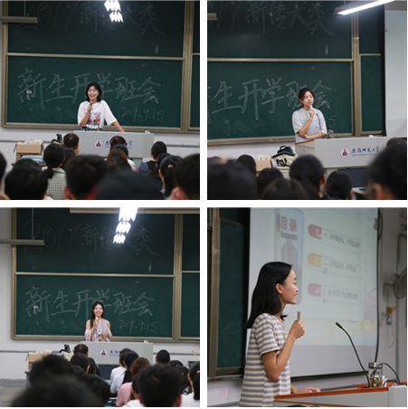 班会中,七位班级导生轮流上台向新生们做自我介绍。陈丹着重介绍了自己对于老师以及班级的期待和支持,而谢妮以互动的形式与新生进行了交流,其他导生的介绍也引起台下同学的阵阵掌声与欢笑。院学生会的两位成员为同学们进行了关于学生会招新的宣讲,进一步为新生们提供了大学生活的有关建议。