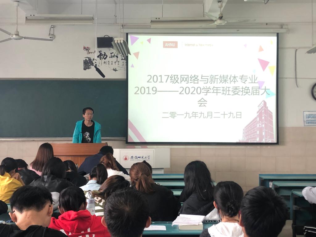 新学期伊始,为了班级工作稳定有序地开展,10月11日上午,2017级网络与新媒体专业召开班委换届选举大会,公开选举2019-2020学年班委会成员,辅导员张雁和全体同学参加了此次会议,会议由团支书宋诗雨主持。