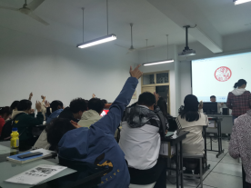活动中,寝室代表上台发言讲解各自寝室成员的设计理念,班长将前期收集的样稿向同学们一一展示。同学们展开了热烈的讨论,并进行举手投票表决。最终定下了班级同学满意的的班徽班旗样式。