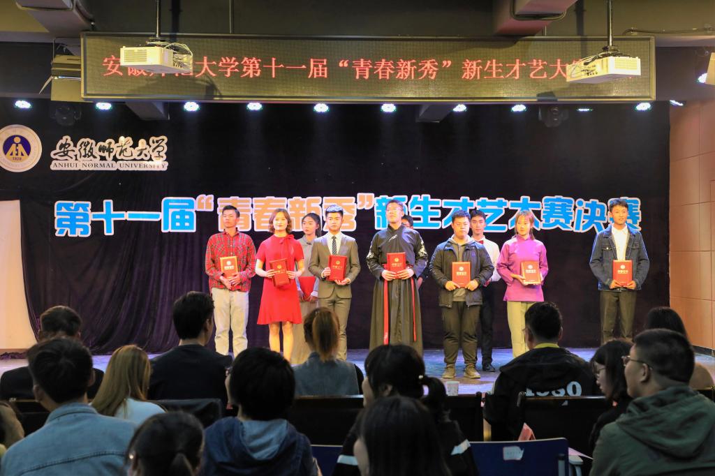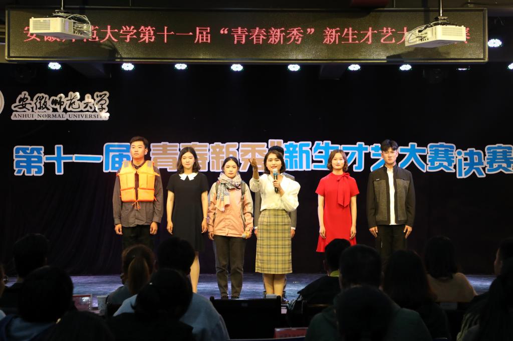 2019年10月27日晚,校第十一届“青春新秀”新生才艺大赛决赛在花津校区大学生活动中心多功能厅举行。此次大赛从9月开始筹备,经过院选、复赛的层层选拔,全校共15个节目进入决赛。比赛共分为蓝色畅享、红色记忆、金色希望三个模块。在第三模块中,由我院选送的朗诵节目《中国记者》热情澎湃、感人肺腑,获得了评委老师和同学们的一致好评,荣获专业组二等奖。