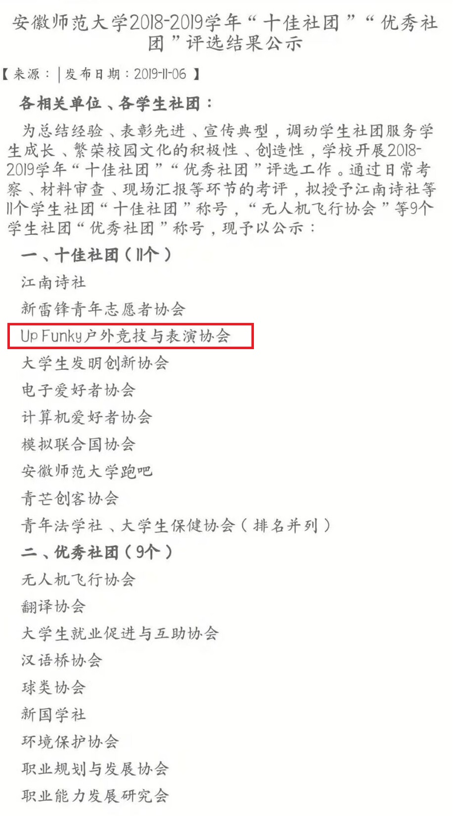 为总结经验,表彰先进,11月6日,学校在大学生活动中心团委多功能厅举行2018-2019学年“十佳社团”、“优秀社团”评选活动。全校有72个社团参与评比,其中前20参与到优秀社团评比中,我院Up Funky户外竞技与表演协会再度入选校“十佳社团”,并取得第三名的好成绩。