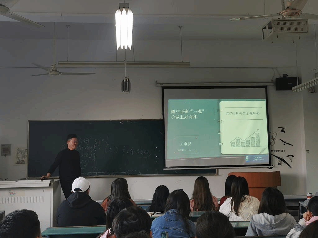 为了进一步加深同学们对于安全的认知,树立规则意识,加强保护环境的意识,形成正确的消费观念,11月14日下午,辅导员王申振老师组织了2017级新闻学专业同学在教学楼2070309开展了一次以“树立正确三观、争做五好青年”为主题的安全教育班会,严抓并认真落实学生安全教育管理工作。