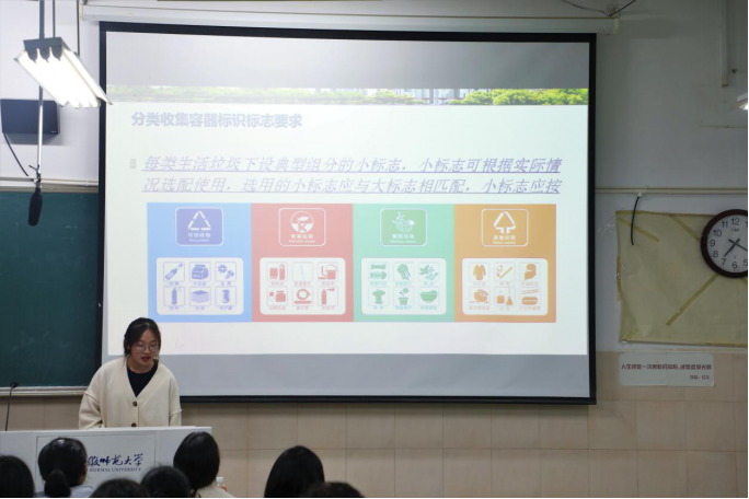 此次主题班会通过展示垃圾分类示意图、播放教学动画视频等多种形式直观系统的学习垃圾分类。针对我校现行的分类措施需分为可回收垃圾、厨余垃圾、有害垃圾、其他垃圾四类,分别对应蓝色、绿色、红色、黄色来垃圾桶进行投放。同学学习积极性、参与度高,通过班委带领学习后的小测验发现,绝大部分同学都能通过班会熟悉垃圾分类。