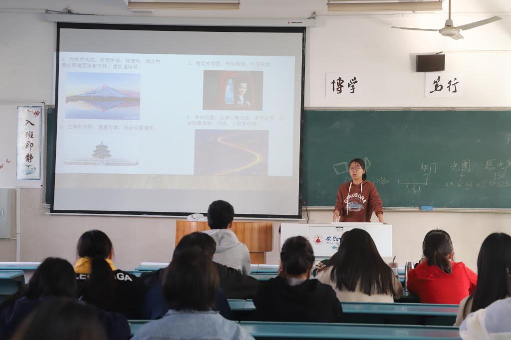 毛昊首先介绍了一些常见的相机款型,它们的功能和优缺点及其所对应的价位区间,随后讲解了摄影的基础知识,如光圈,快门,感光度等,并对摄影技巧方面的内容进行了补充,其中包括约拍时应如何布光,相机的四个档位以及四种测光方式等等。随后,她和参加学生一同欣赏了摄影师何潘的作品。