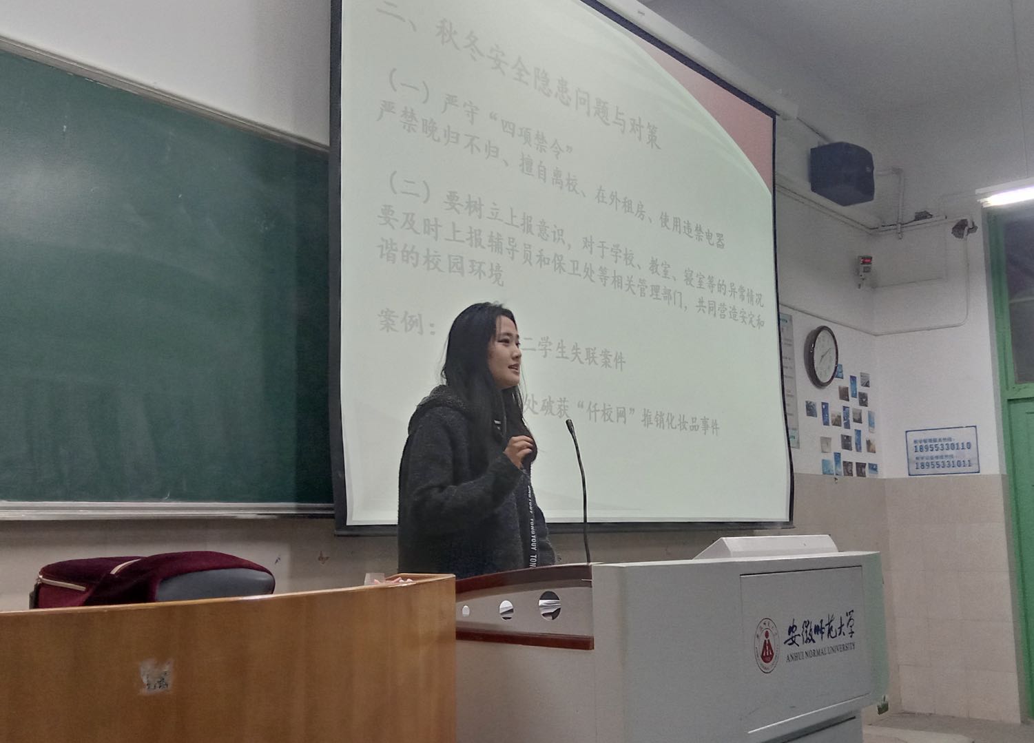 会上,李梦圆首先说明了校园贷的危害,提醒同学们加强自我保护意识,提高辨别是非的能力,谨防上当受骗。接着联系近期网络暴力事件频发说到网络文明与信息安全,要求同学们文明上网,遵守网络公约,不做“键盘侠”,并要注重保护个人隐私。李梦圆结合某学院大二女学生失联和寝室用电失火等具体案例讲述秋冬季安全隐患问题与对策。多次强调晚归不归与使用违规电器的严重性,将同学们的人身安全放在首位。李梦圆让两班班委说明班级近期情况,提醒同学们认真复习,并提出将要增加查寝次数,以保证同学们的在校安全。