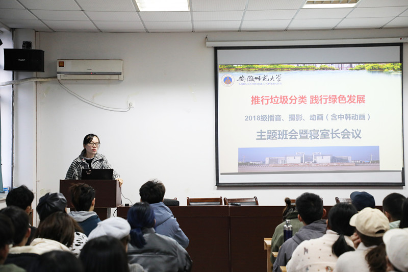 为积极响应校园垃圾分类行动的号召,营造干净整洁的学习生活环境和和谐文明的校园氛围,2019年11月29日下午,2018级播音、摄影、动画、中韩动画班级于学院四楼会议室召开主题班会,班会由辅导员老师孙月婷主持。