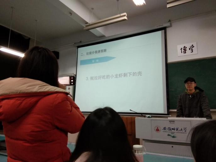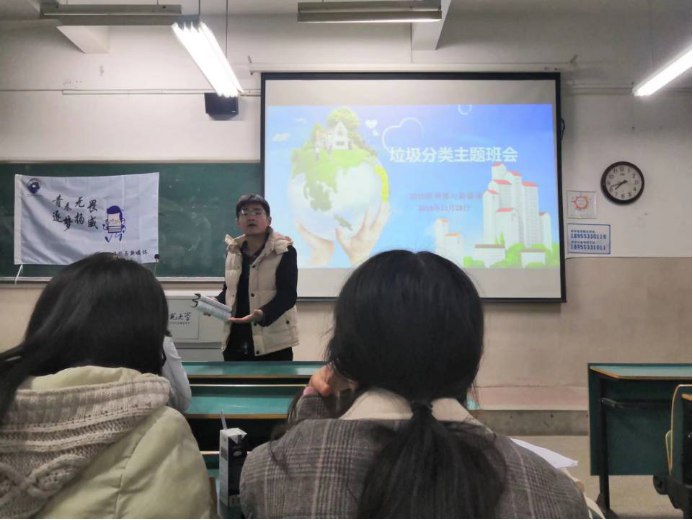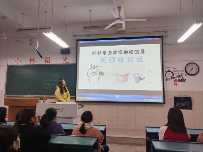 11月26日晚,2018级新闻班在2050402召开了“垃圾分类”主题班会。该班会由团支书戚梦媛主持。会前,由戚梦媛提出,要求以寝室为单位,由寝室长牵头,组织学习有关垃圾分类的知识。会上,戚梦媛先向大家展示了,在垃圾分类正式开始实行的前夜学校垃圾桶堆积如山的场景,引发了同学们的共鸣。接着便开始了垃圾分类有奖竞答活动,通过生动有趣的情景题,对同学们日常生活中会遇到垃圾分类难题一一进行了讲解。在一片欢声笑语中完成了对垃圾分类知识的学习,并对答对题数较多的寝室给予了垃圾桶、垃圾袋的小奖励。最后,又以一个小短片,帮助大家强化对“如何垃圾分类”的认识。
