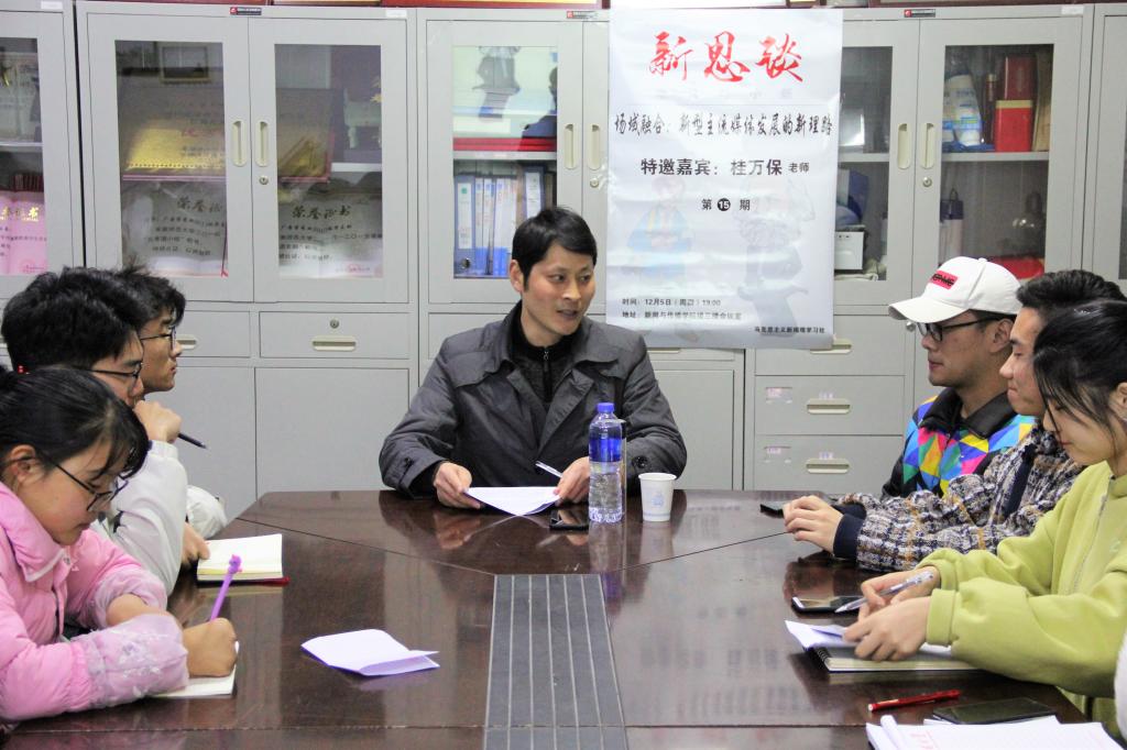 12月15日晚7点,马克思主义新闻观学习社在德赢AC米兰合作伙伴楼三楼会议室举办第十五期新思谈活动。新闻学专业教师桂万保受邀担任主讲嘉宾,与前来听讲的学子畅谈场域融合和新型主流媒体发展的新理路。