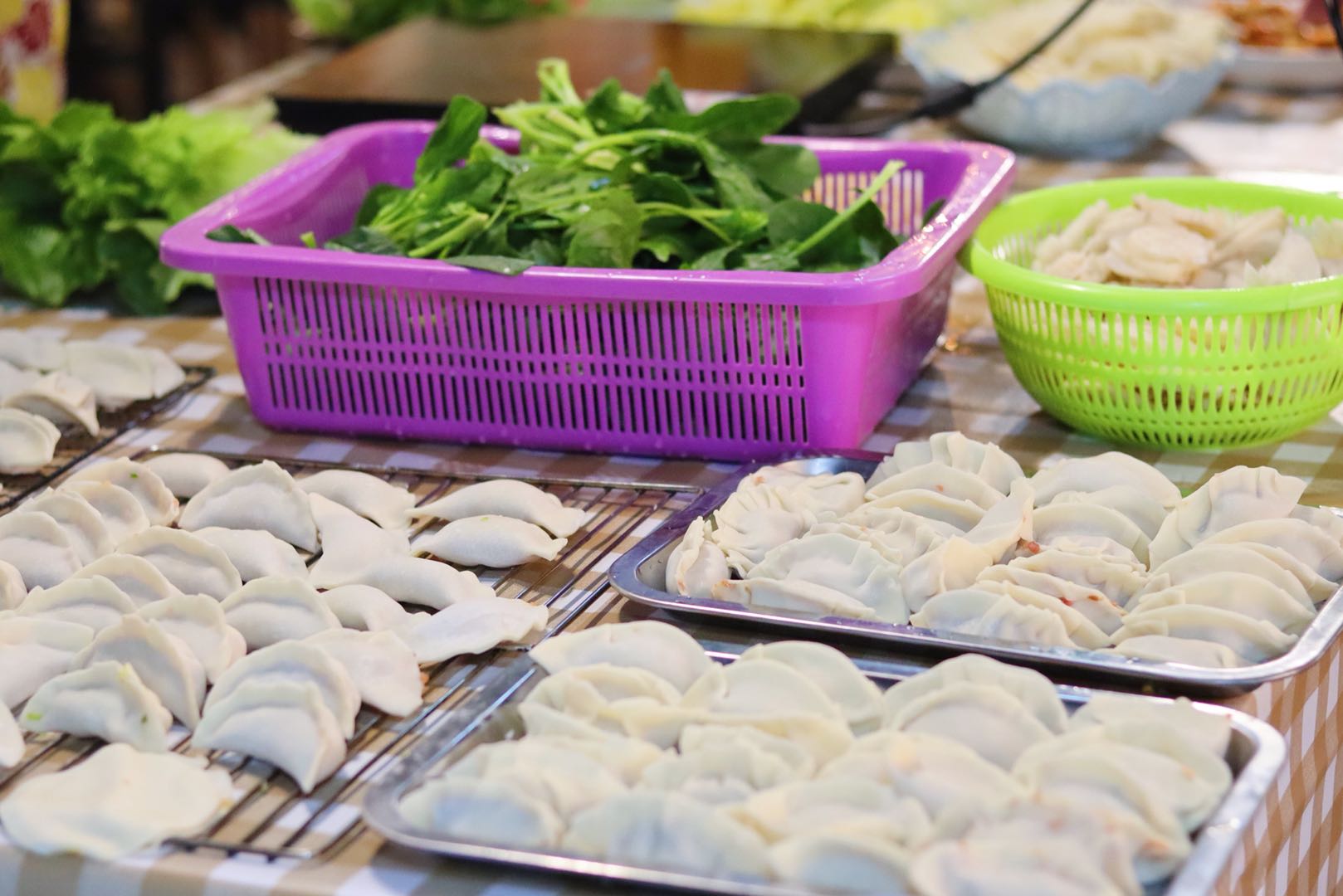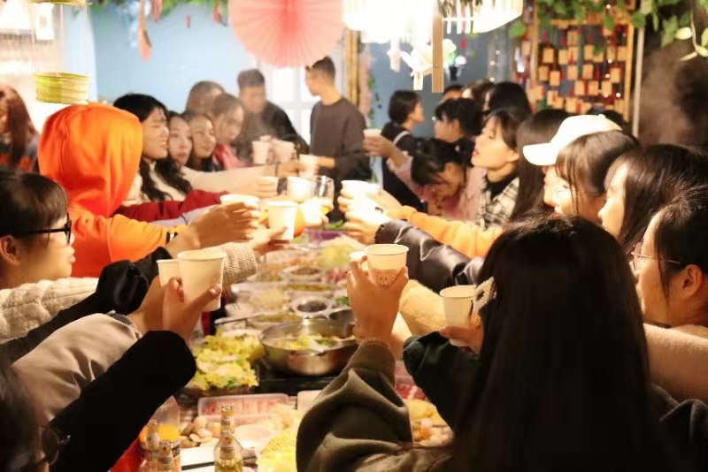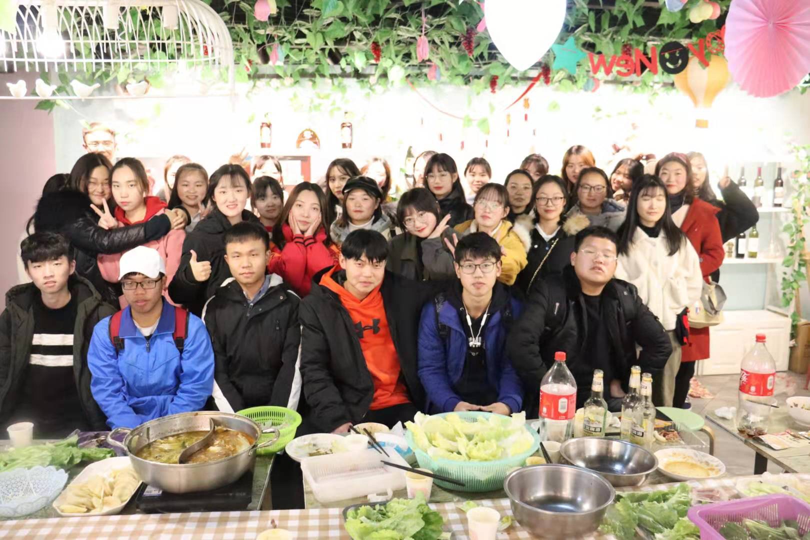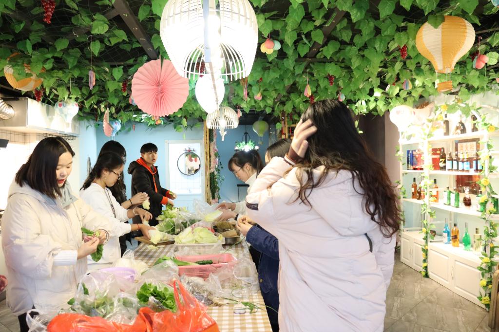 为做好本次团建工作,部分班委与部分志愿者同学共8人集合共同购买食材。尽管这天天公不作美,下着雨,天气也很冷,来到菜场,人很多,因为下雨的缘故,路也很不好走,但同学们没有一句抱怨,以菜市场的“老手”的状态熟练地砍价,有条不紊地购买食材,挑选食材的时候货比三家,仔细挑选,只为让同学们能吃到更多、更好、更新鲜的食材。下午四点,同学们陆续到达轰趴馆,班委和会做菜的同学开始准备食材。轰趴团建开始后,场面更是热闹至极。一楼的KTV、台球桌,三楼的电影院、拍照区,四楼的游戏室,各种休闲娱乐设施让同学们应接不暇。二楼的厨房也成了同学们的聚集地。很多同学都来帮忙,洗菜,择菜,炒菜,包饺子,很多在家里十指不沾阳春水的同学开玩笑地说道,妈妈看到她们在干活会感动哭的。一些会做菜的同学大显身手,大家通力合作,一道道色香味俱全的美食就很快上桌了:咖喱土豆、水煮肉片、可乐鸡翅、油焖大虾、火锅、还有大家一起包的饺子,各种美食,大家围坐在一起,好似在吃年夜饭,共同迎接2020年新年的到来,这种家一样的氛围和家一样的味道弥漫在同学们的中间,充斥在同学们的心间。