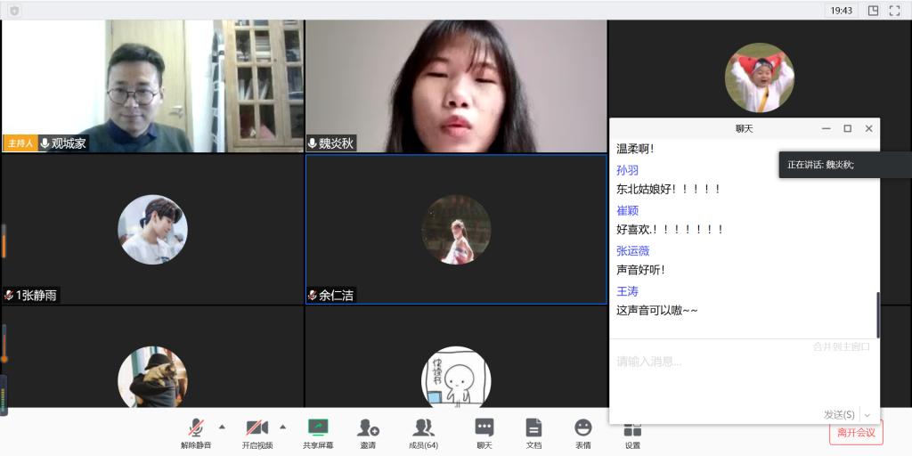 2019级新闻传播学类辅导员马星宇在3月14-15日分班级召开了网络主题班会。他结合当前疫情引发的假期延长、线上学习与专业实践等存在的问题,以“如何度过这个超长假期?”为主题为全体学生深入浅出地梳理了宅家学生的学习生活的现状、出现问题的原因、如何学习实践的方法。