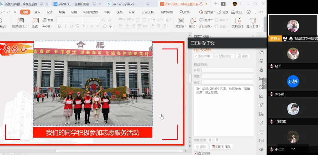 马星宇的主题班会首先从一条家长的信息说起,用“六个天地”形象地总结了同学们在假期里的状态,为同学们敲响警钟,提醒停课不停学。他还就大一入学以来同学们存在的大学适应性的状态作了精辟总结,将当前大学生宅家状态和盘拖出。关于如何将学习变得有趣,做到从专业的角度整理和分析问题,马星宇从追剧和班情班貌梳理上为例做了说明,如《鹤唳华亭》中出现的“邸报事件”,提醒同学们将其作为新闻史中的邸报概念加以研究和阐述,并以《人民的名义》、《舌尖上的中国》等“大片”让同学们重新以专业知识回顾。他还结合各班同学假期里的专业实践创作,邀请部分同学分享经验。如提到校园数据新闻可视化时,让先前有过经验的同学分享经验。如1班王翼飞分享了他是如何利用网络资源获取知网学习材料的路径,丁悦分享了自己与团队在合肥火车站参与春运志愿服务的经历;2班刘久玉分享了参加线上创作志愿服务的工作;3班汪楚楚则为大家简单分享了关于同学社会组织任职、四级成绩统计分析可视化内容制作的经验和收获。从数据的收集到处理,从专业知识到技术能力,制作内容综合能力的要求较强,还望大家在假期借此时间提升自身的技能。