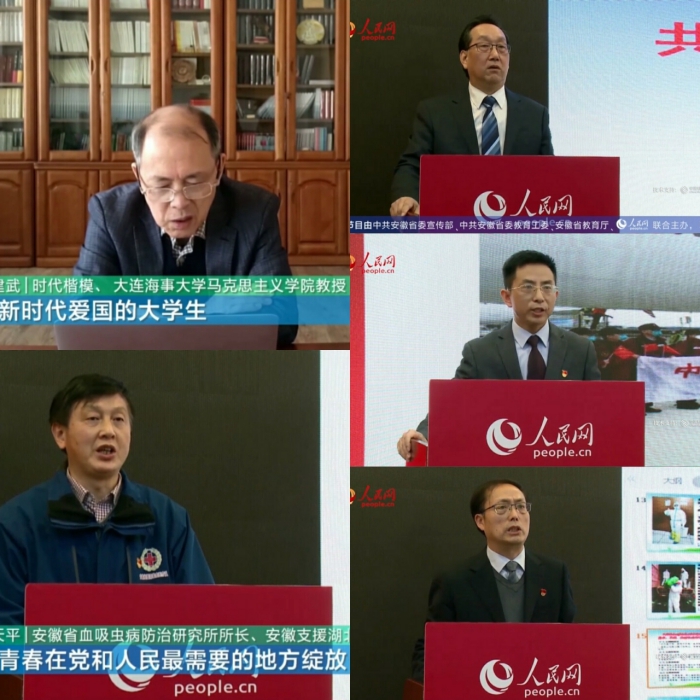 本次“同上一堂战‘疫’思政大课”安徽专场,邀请了教育部思想道德修养与法律基础课教学指导委员会副主任委员、大连海事大学马克思主义学院曲建武教授,安徽援鄂抗疫医疗队总领队、安徽省血吸虫病防治研究所所长、主任医师汪天平,安徽中医药大学马克思主义学院院长董玉节教授,合肥师范学院副院长姚本先教授,中共安徽省委党校马克思主义学院院长汪兴福教授作为主讲嘉宾。他们结合疫情防控,讲述战“疫”一线的感人故事,分析疫情防控过程中彰显出的中国共产党领导和中国特色社会主义制度的显著优势,引导广大青年学生正确认识和看待此次战“疫”,树立责任担当意识,激发爱党爱国爱社会主义深厚情怀。