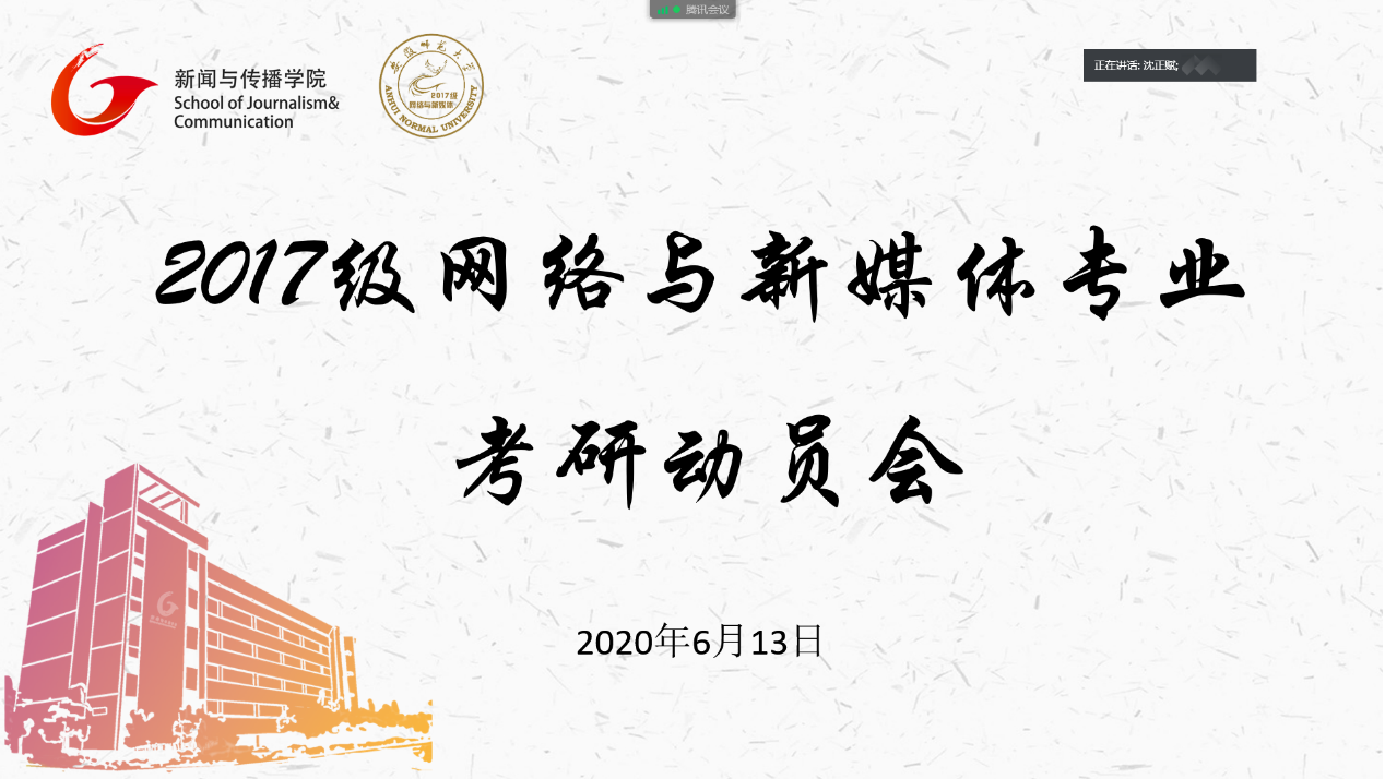 6月13日,网络与新媒体专业以“云”班会形式于腾讯会议召开考研动员会。德赢AC米兰合作伙伴副院长沈正赋,专业教师翟光勇、张军辉、杨帆、高月、王睿,辅导员张雁及2017级网新专业全体学生共同参会,专业主任林燕主持会议。
