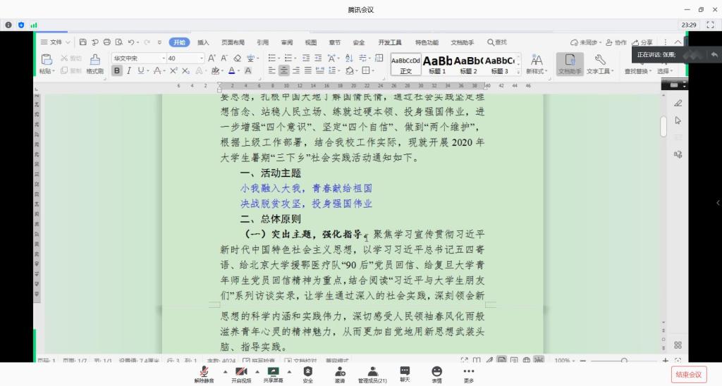 最后,张雁强调了青年大学习的重要性,暑期仍要积极展开学习。“青年大学习”不局限于每周一次的网上主题团课,习近平总书记五四寄语、给北京大学援鄂医疗队“90 后”党员回信、给复旦大学青年师生党员回信精神等都是青年学生们需要学习贯彻的内容。
