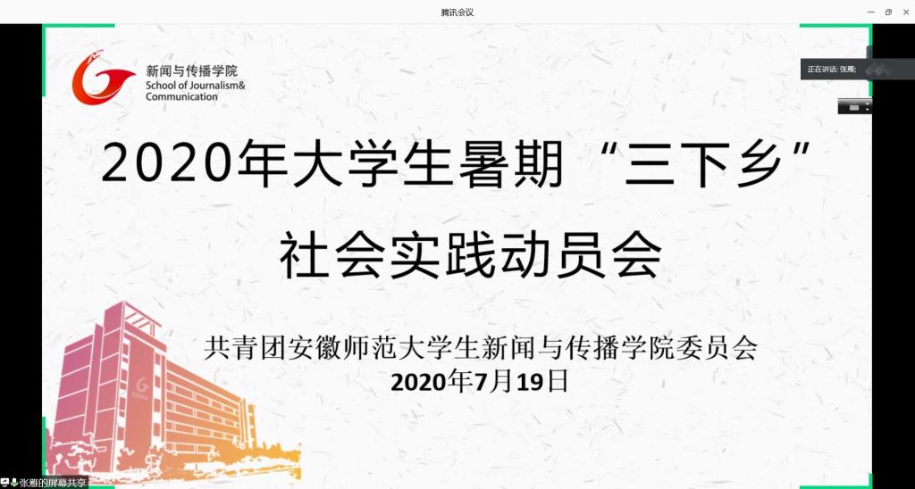 会上,张雁详细解读了《关于在疫情防控常态化形势下开展2020年大学生暑期“三下乡”社会实践活动的通知》,动员新传学子踊跃参与“三下乡”社会实践活动,通过社会实践坚定理想信念、站稳人民立场、练就过硬本领、投身强国伟业。