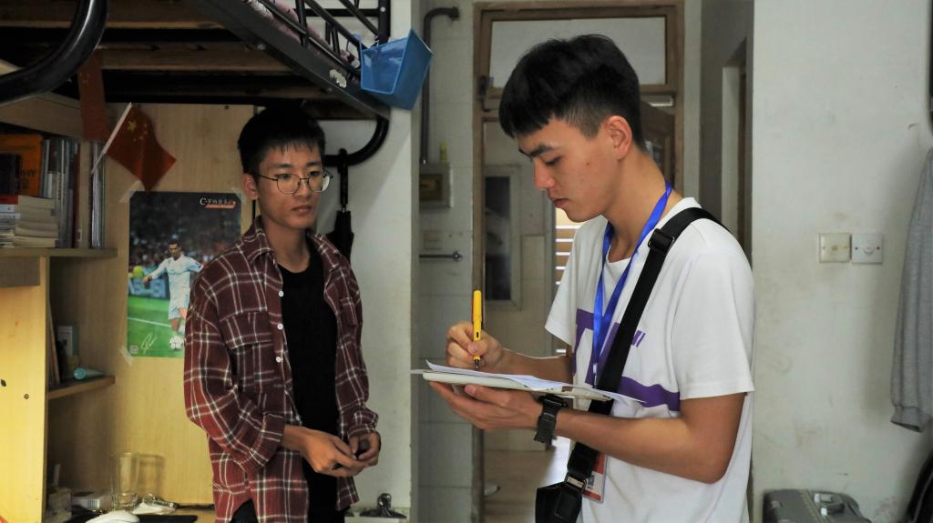 26日下午,团委学会生工作同学们于19栋寝室楼下集合,进行任务分配、分数登记表格分发。学生会负责人王儒钰提醒工作人员做好记录,在确保寝室有人的情况下才可进入寝室进行检查,防止出现学生财务丢失等问题。同时,在查寝时要注重礼貌用语,敲门、查看卫生时举止得体、态度友善,展现出院团委学生会良好的精神风貌。此次寝室安全、卫生检查工作评分标准共有四个方面,即门口是否堆放垃圾、洗手台物品摆放是否整洁、地面阳台是否整洁、寝室是否有异味。同时,对寝室安全隐患、违规电器使用、晨午晚检都进行了细致的排查。