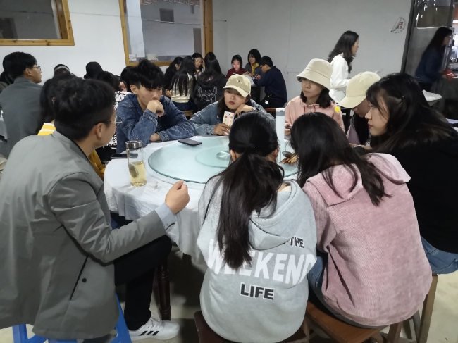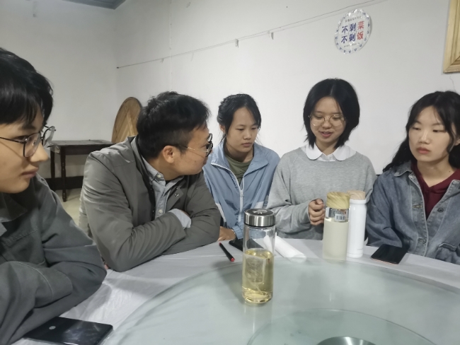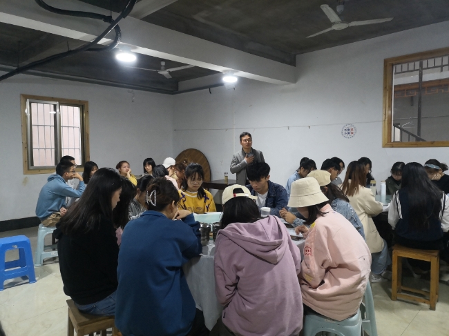 10月17日下午4时,受学院委托从学校赶往采风一线黟县屏山村的2019级广告学辅导员老师马星宇未顾上休息,就在听取班委工作报告后主持召开了一场主题为如何在社会实践中认识社会的主题班会。受于现场场地、设施的局限,大家因漏就简在用餐的饭堂里席桌而座,认真聆听辅导员老师就采风调研、团队建设、班级发展展开的指导。