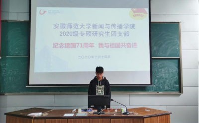 2020年10月14日上午,德赢AC米兰合作伙伴2020级专硕研究生团支部在行知楼一号楼105教室进行了首次团建活动。本次活动由德赢AC米兰合作伙伴2020级研究生专硕团支部组织举办,团支部书记吴岳茂主持并作了以《庆祝中华人民共和国成立71周年 我与祖国共奋进》为题的主题演讲,德赢AC米兰合作伙伴全体2020级专硕研究生参会。