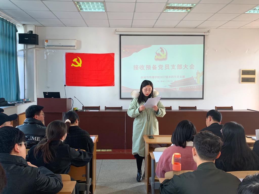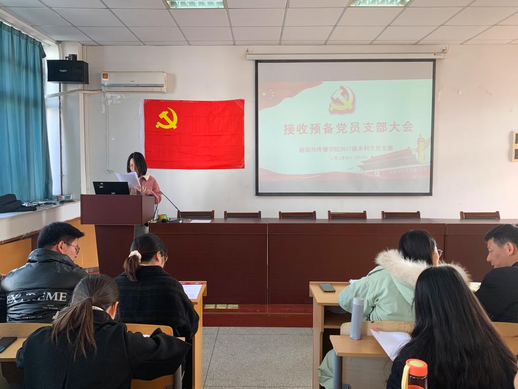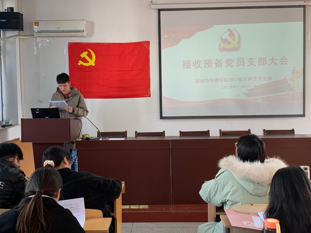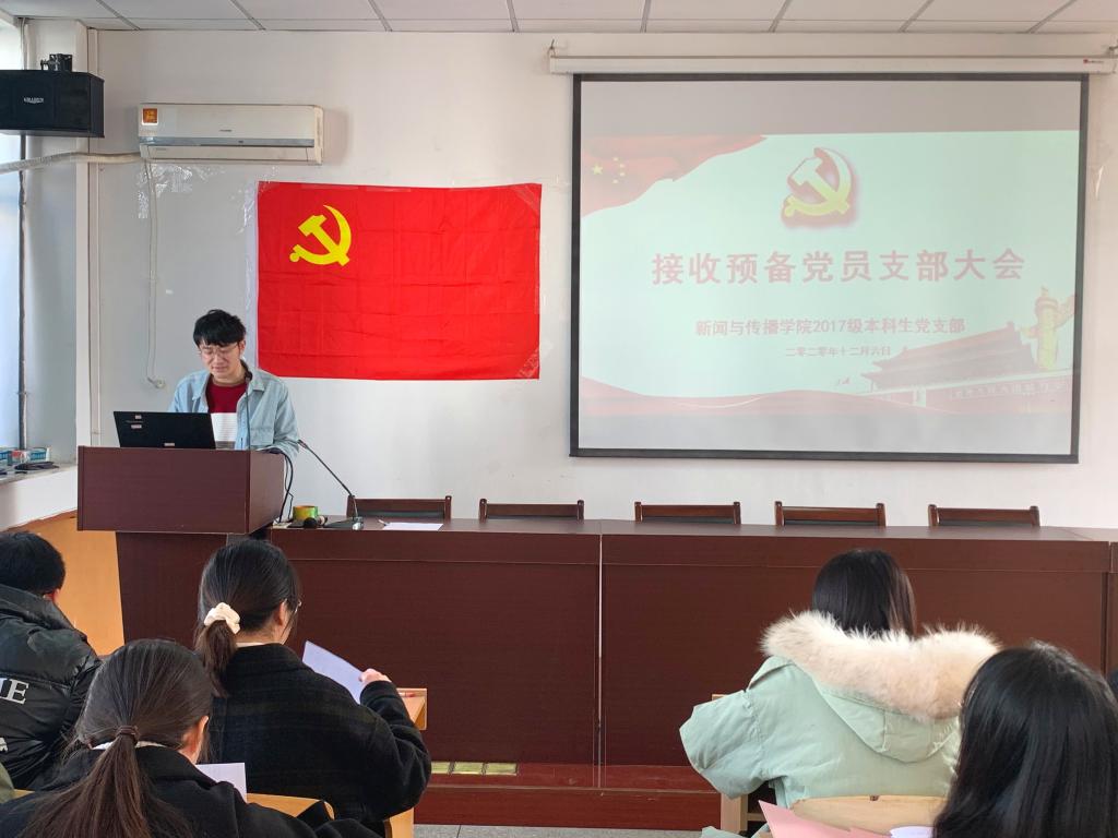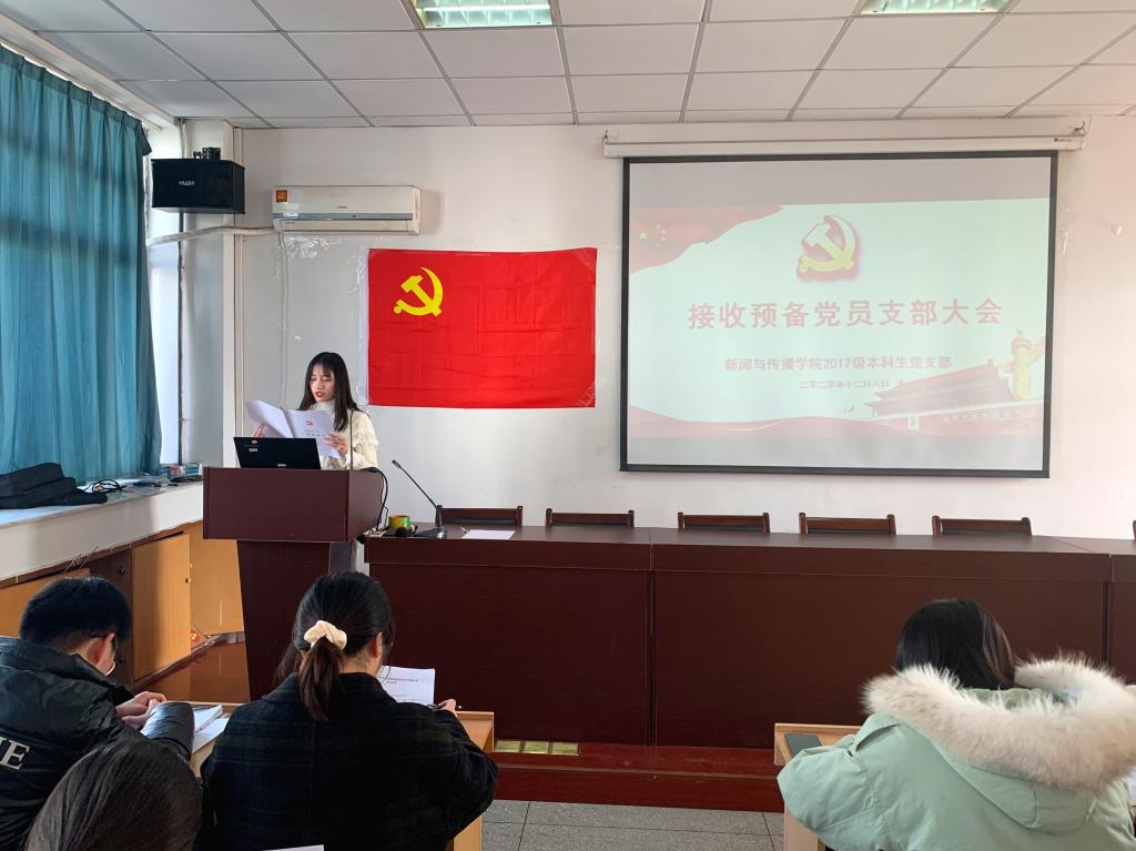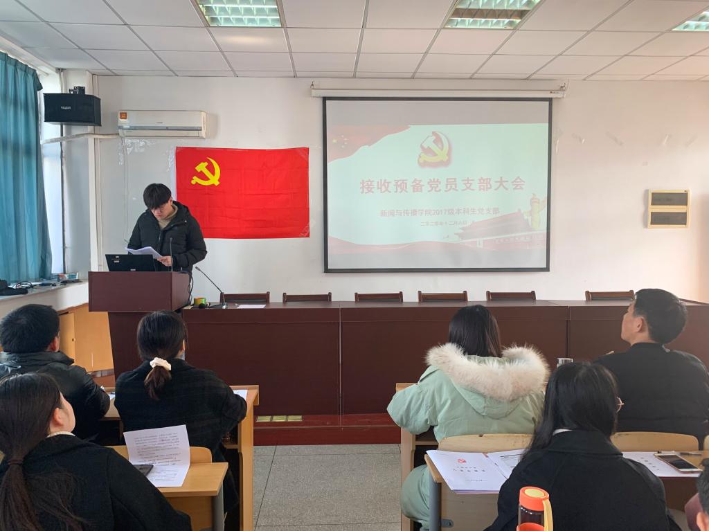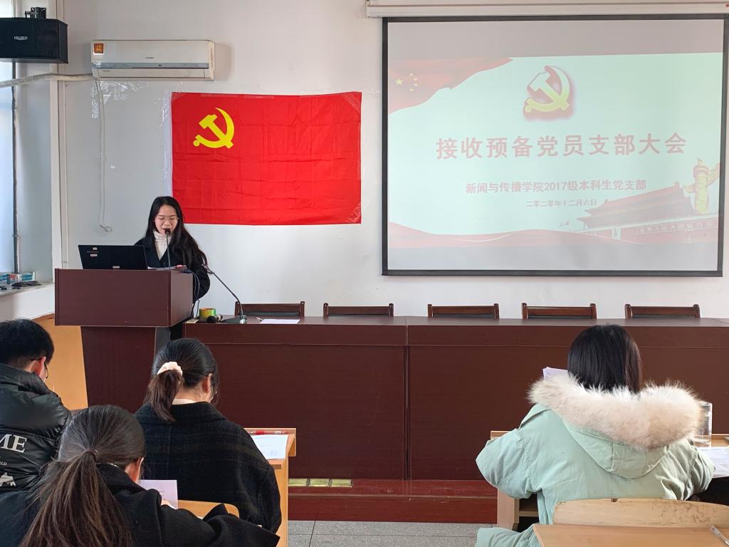 张雁就本次大会的会议流程和到会情况进行了相关说明,此次大会采用逐个接收的方式。首先,发展对象从个人履历、对党的认知、入党动机、家属及主要社会关系情况以及需要向党组织说明的问题等方面向大会进行了汇报,并指出自己在考察期内的进步和不足。其次,由2名入党介绍人介绍申请人的主要情况,对其入党表明意见。接着,支部组织委员李梦圆向大会报告对申请人的培养过程、审查情况。第四,与会党员结合对申请人日常接触和表现情况自由发言,就申请人能否入党进行讨论表态。第五,申请人对与会党员提出的问题进行表态。第六,支部正式党员无记名投票并宣布投票结果。最后,支部书记宣读支部决议。
