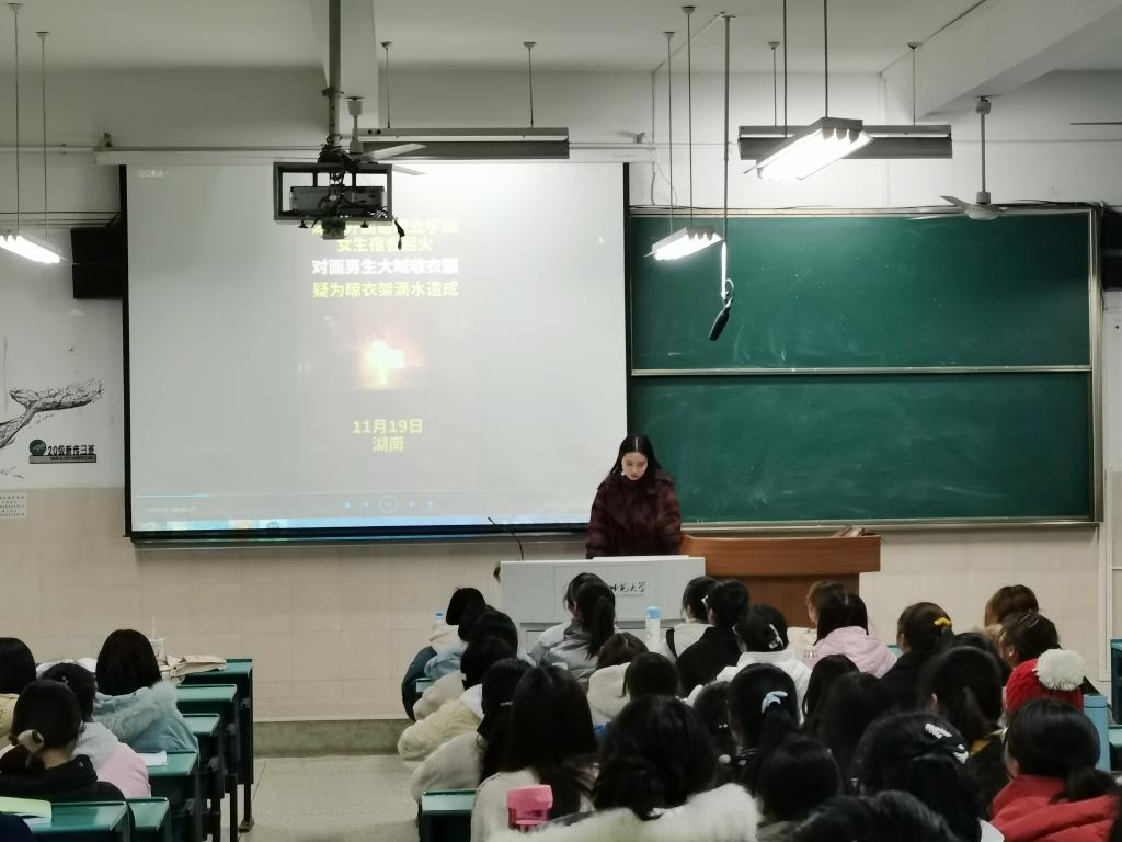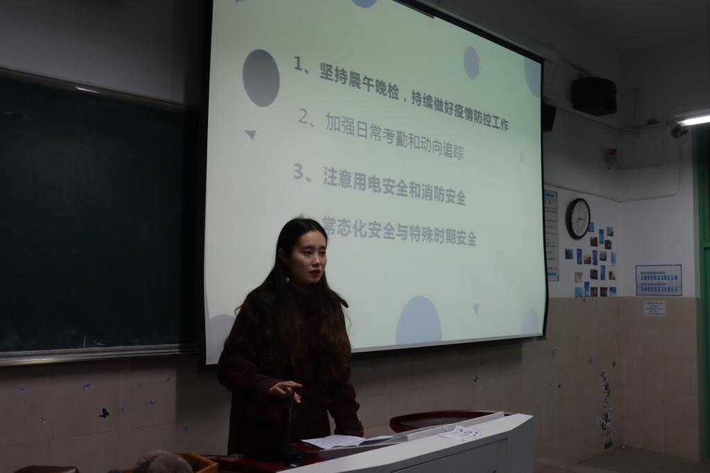 围绕冬季安全这个主题,梁嘉从四个方面对学生提出要求:首先是坚持晨午晚检,持续做好疫情防控工作。她带学生学习回顾了《疫情防护知识手册》部分内容,教育学生积极学习宣传防疫知识,严格遵守关于疫情防控的各项规定,听从学校安排,不随意外出,勤洗手,出门戴口罩,积极配合查验,每日定时汇报健康情况;其次是加强日考勤和动向追踪。她着重强调了考勤在系统聚焦校园学生安全管理,提供多种“预警”机制,帮助学校降低学生发生意外的风险方面的重要性,提出要加强日考勤和动向追踪确保教学质量与学生人身安全;再次是注意用电安全和消防安全。她通过几起大学宿舍失火的典型案例视频向同学们强调用电安全和消防安全的重要性,再次强调寝室禁严禁卷发棒等违规电器,并告诉同学们要养成出门及时拔掉插头的好习惯;最后是常态化安全与特殊时期安全。会中,还强调了严禁未经批准无故晚归;严禁未经批准擅自出租、出借、调换宿舍床位或者留宿宿舍以外人员;严禁不履行宿舍内公共义务,不讲究卫生,干扰他人学习且经教育不改;严禁饲养或收容宠物等校规校纪内容。