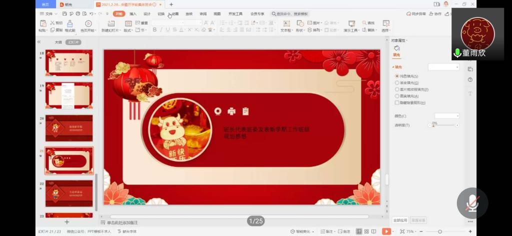 团支部大会后,班长董雨欣主持了线上班会并首先发言。董雨欣对上学期班级工作做出总结。她表示,在班级建设方面,19广告班组织了很多活动,虽然存在小错误和小瑕疵,但整体上算圆满,也正是在不断的反思总结中同学们渐彼此了解;个人学习方面,19广告班的郭宜璐和朱亮同学参加的数据新闻队伍作品在中国科学报发表,韦慧妍同学的学习强国征文作品获得省级二等奖。班长董雨欣提出,所有荣誉都是同学们努力的结果,但是重量级奖项还太少,需要做出针对性动员。接着,董雨欣提出新学期班级工作规划。第一点,学科比赛中重中之重是“大广赛”,动员同学们提前了解赛事做好准备;第二点,在遵守防疫要求的前提下继续进行班级志愿服务活动。第三点,正常召开班级日常会议,逐步完善构建富有专业特色和班级特点的特色活动;第四点,班级集体活动要鼓励动员全体同学共同参与,强化活动推进的执行力和团队精神。最后,董雨欣同学提醒同学们在假期临近结束前陪伴家人,做好返校防护。
