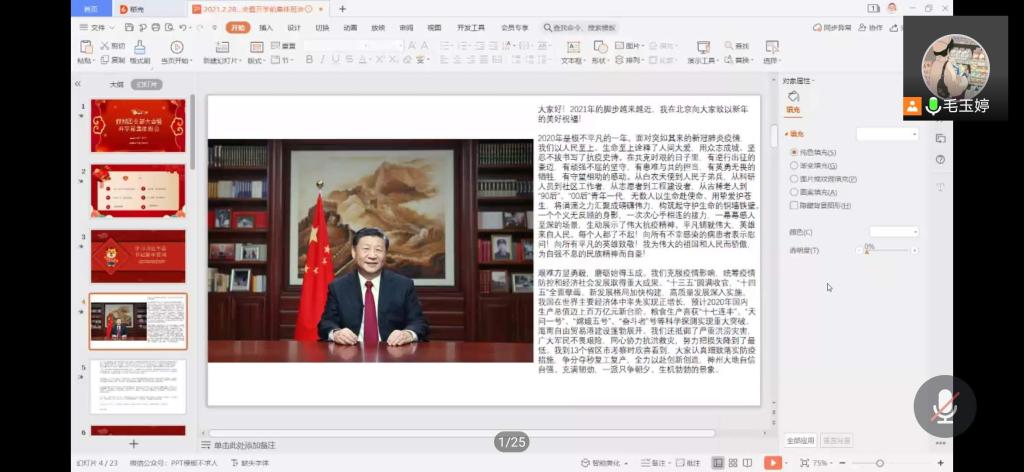 首先,毛玉婷同学带领同学们一起学习习近平总书记新年贺词,抗击疫情谱写英雄史诗、脱贫攻坚取得伟大胜利、粮食生产喜获“十七连丰”、科学探测实现重大突破、隆重庆祝深圳等经济特区建立40周年、上海浦东开发开放30周、中国共产党百年华诞,实现中华民族伟大复兴值得期待,这些值得国人感动、骄傲、充满期待的事情正一件件在中国上演。