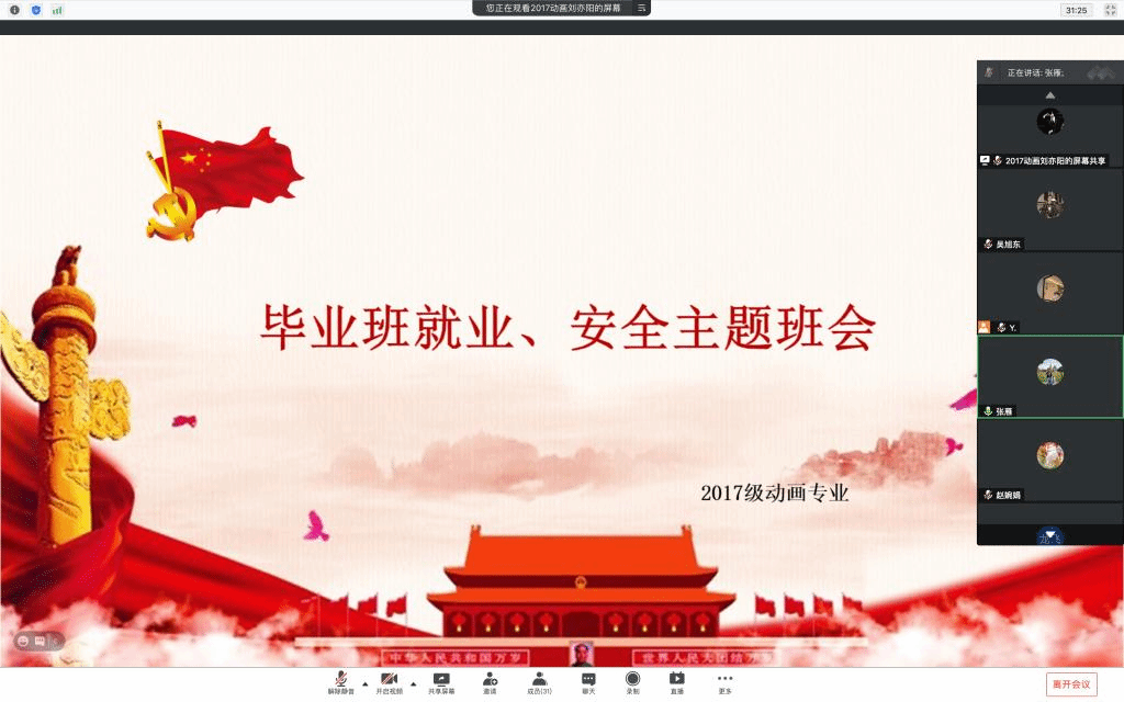 3月25日晚,2017级动画专业在腾讯会议召开了毕业班就业、安全主题班会,会议由辅导员张雁主持,全体同学参会。