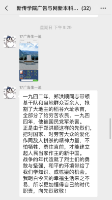 战争时代,“正是由于郑洪顺这样的先烈们,把对国家、对劳苦大众的爱化作同敌人拼杀的精神力量,不怕牺牲,勇往直前,才能建立起人民当家作主的新中国。”2017级广告学专业的生一迪表达了对战争年代革命先烈们的缅怀,歌颂了他们不惧艰辛、一心为国的革命情怀。