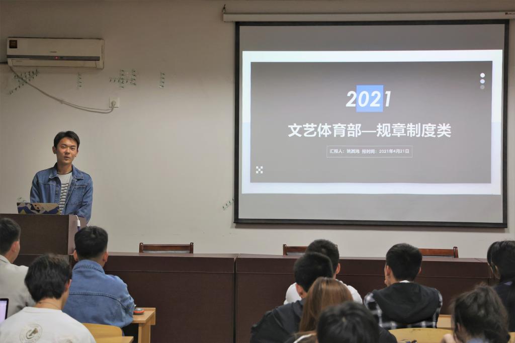 文体部副部长姚其玮就规章制度类对全体成员进行了教育培训汇报,从国家及学联相关文件学习到部分工作完成情况,他提出:要明确职能定位,担当学校联系广大同学的桥梁和纽带;要改革运行机制,精简学生会组织架构,优化机构和人员规模;要明确入选条件,理想信念坚定,积极拥护共产党,具有强烈爱国意识;要坚持从严治会,加强日常教育管理,培养优良工作作风。此外,可以从规范召开代表大会、建立述职评议制度等方面着手加强学生会组织建设。生活权益部副部长江睿依据其部门特点,在明确自身定位,培养服务意识和奉献精神,增强工作责任感上给学生会全体工作人员提出了很好的意见要求。