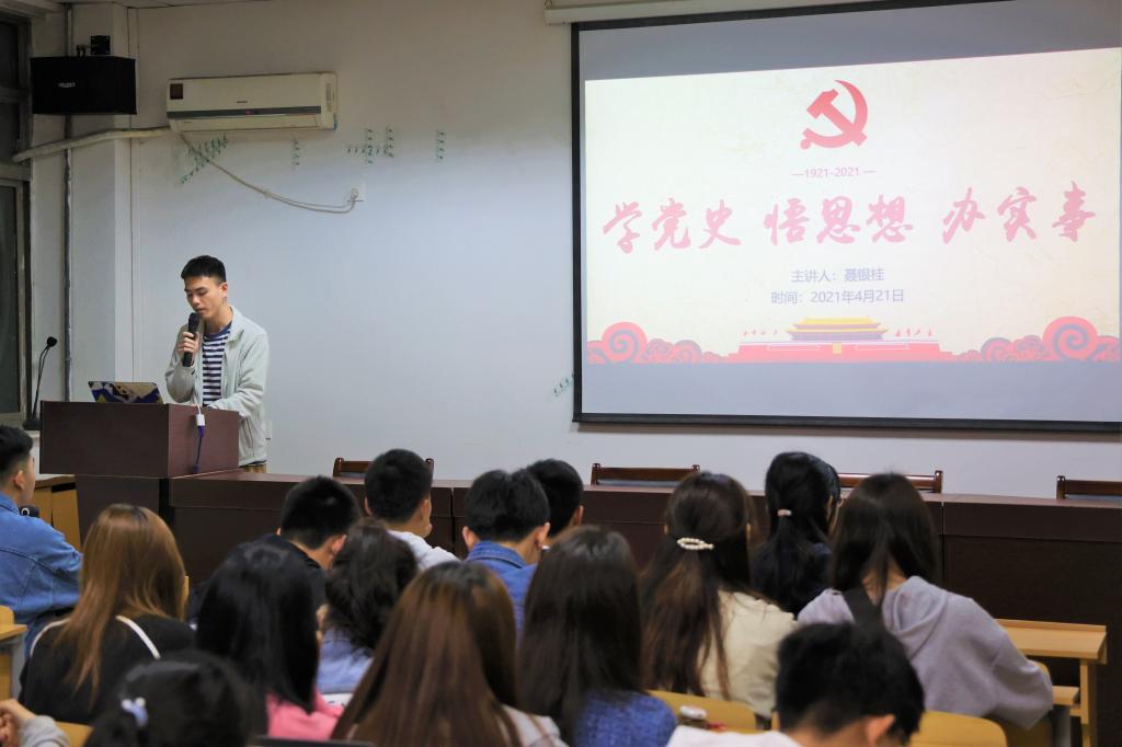 培训会开始,学习部部长聂银桂带领大家进行党史学习。他从新民主主义革命时期、社会主义革命和建设时期、改革开放和社会主义现代化建设时期这三个党的历史成长阶段出发,回顾了中国共产党的辉煌历史。从中共一大到遵义会议,从长征会师到抗战胜利,从新中国成立到实行改革开放,中国共产党带领中国人民一步一步站起来强起来,并将在新的世纪中继续谱写更加壮丽的篇章。聂银桂还在讲述中建议,同学们作为年青一代,认真学习党的历史,对继承和发扬光大革命传统、党的优良作风,对提高自己的认识能力和处理实际问题的能力都是十分必要和有益的。