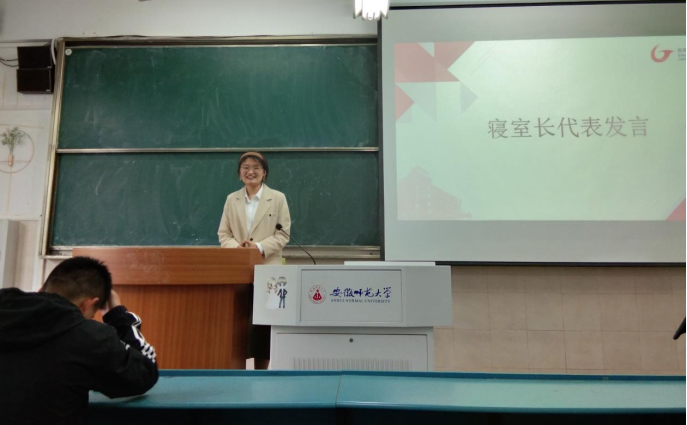 刘熠就校安全管理相关规章制度做了说明并宣读,向每个寝室长做出了工作职责的明确要求。他表示,寝室长要模范遵守学校的相关管理规定,配合老师和班委严格做好寝室管理教育工作;保证寝室的清洁,寝室卫生实行轮值制;注意用电安全,杜绝火灾隐患。寝室内严禁使用明火、违规电器、种灶具以及其他违规物品;并就每晚“零点报告”和平日、假期离返校的暂行规定做了具体强调,特别要求寝室长如实报告室友在寝情况,以负责的态度做好信息搜集与反馈。