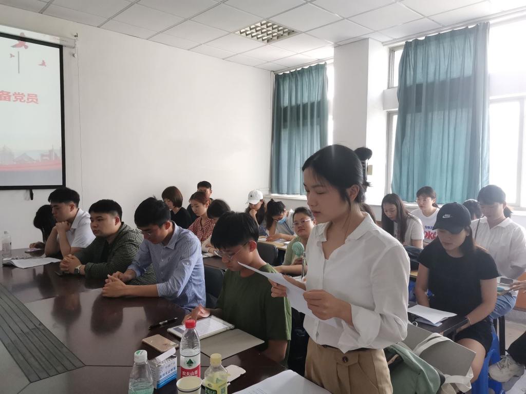 接收预备党员支部大会在庄严的国歌声中开始。葛欣航老师首先就发展党员的组织原则、会议流程及涉及党员发展的相关事宜做了详细说明。本次发展对象刘斌、汪梦琪、吴帅帅、吴岳茂四名同学逐个向大会宣读了自己的入党志愿书,并就需要向党组织说明的问题进行了报告。入党介绍人结合群众座谈会的情况分别介绍了各自发展对象的培养过程、对其是否可以被接收为中共预备党员表明了自己的态度。支部委员向全体党员报告了对发展对象直系亲属和主要家庭成员的函调结果及组织审查情况。