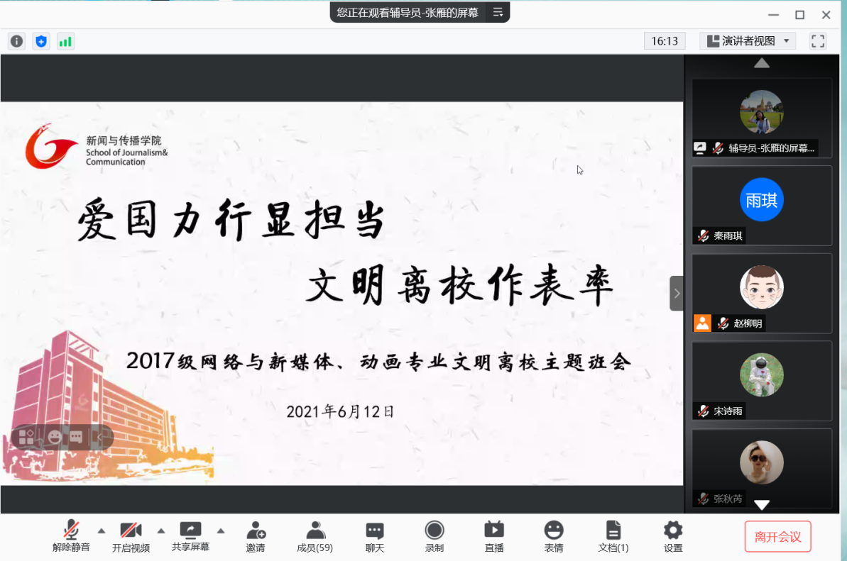 6月12日,为保障文明离校工作顺利推进,2017级网络与新媒体、动画专业召开“爱国力行显担当,文明离校作表率”主题班会,就有序离校进行细致安排和布置,会议由辅导员张雁主持,毕业班成员参加。