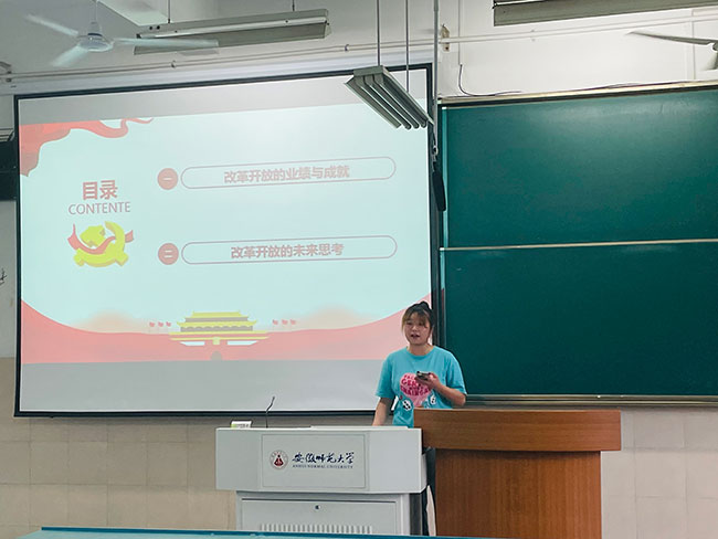 毛玉婷首先带领同学们学习改革开放史。她谈到了改革开放的业绩与成就,指出改革开放以来,我国经济质量显著提升,人民生活水平极大提高,社会生产力水平高速发展,科学技术日新月异,文化事业繁荣发展,民生改革阔步前进,人民真真切切地感受到越来越强的幸福感。学习内容从中国要向国人、世界表面改革开放的坚定意志,中国要通过新一轮扩大开发来为经济全球化树立“中国榜样”,中国要勇于打破国际保守主义和精致利己主义的“零和思维”战略桎梏三个方面引出对改革开放的未来思考——在新时期、新时代,我们需要同世界各国一道努力,共同参与全球治理,共同分享改革开放成果,共同推动世界大家庭发展进步,共同谱写新时期人类命运共同体新篇章。