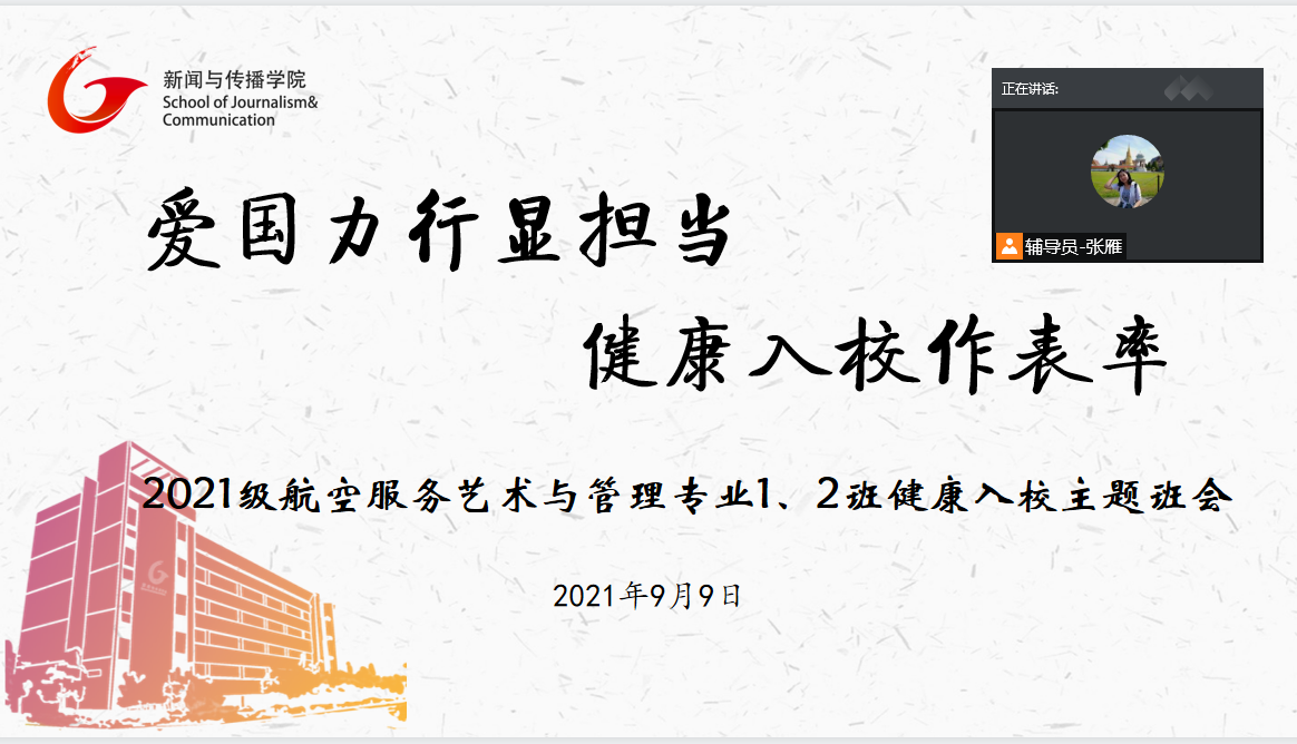 9月9日晚,2021级航空服务艺术与管理专业1、2班在腾讯会议线上召开了健康入校主题班会,会议由辅导员张雁主持,全体成员上线参会。
