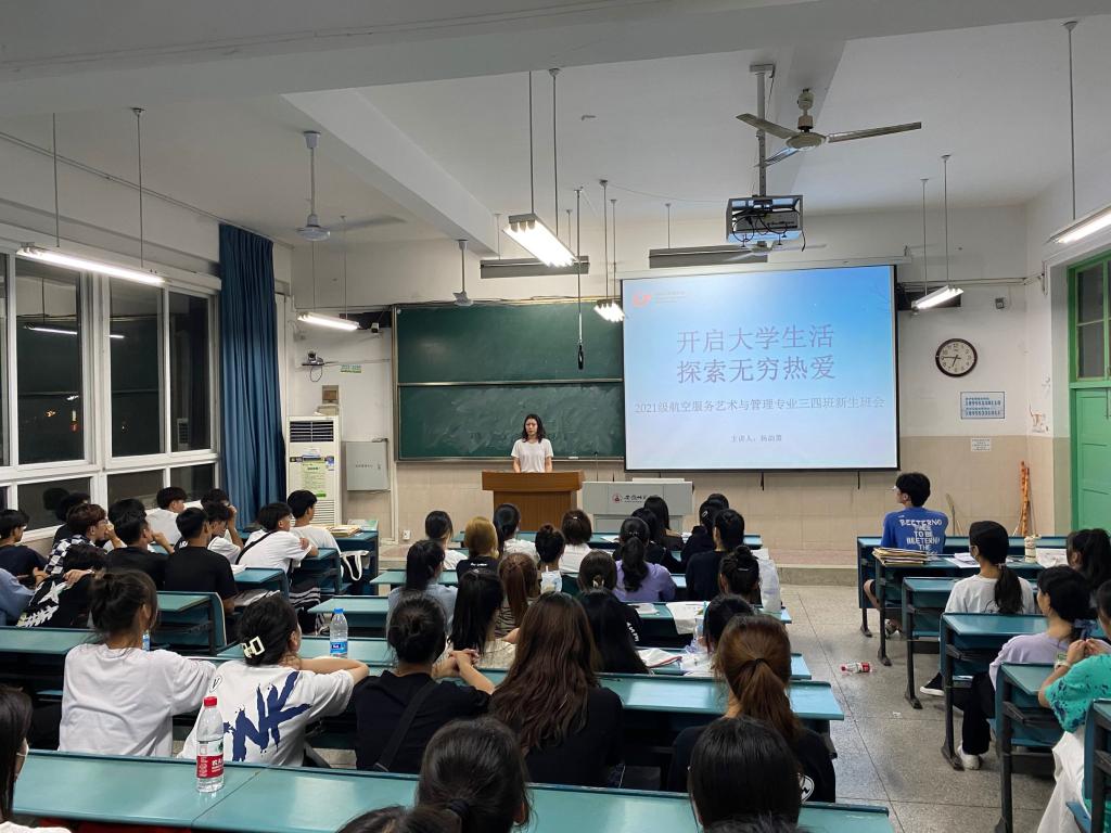 9月12日18时,在行知楼5号楼103教室召开了2021级航空服务艺术与管理三班、四班新生班会。会议由辅导员杨韵箫主持,班级全体成员准时参会。